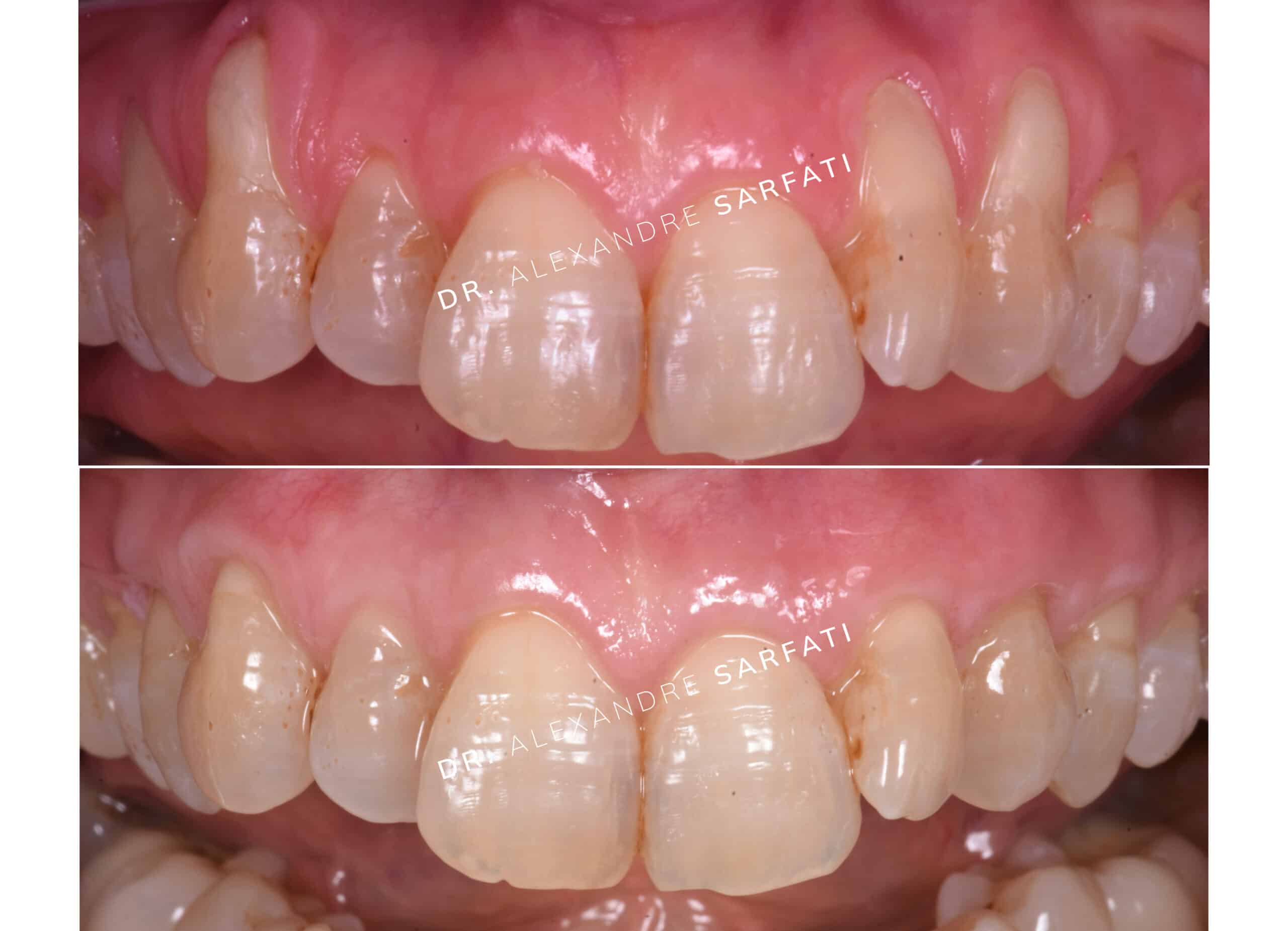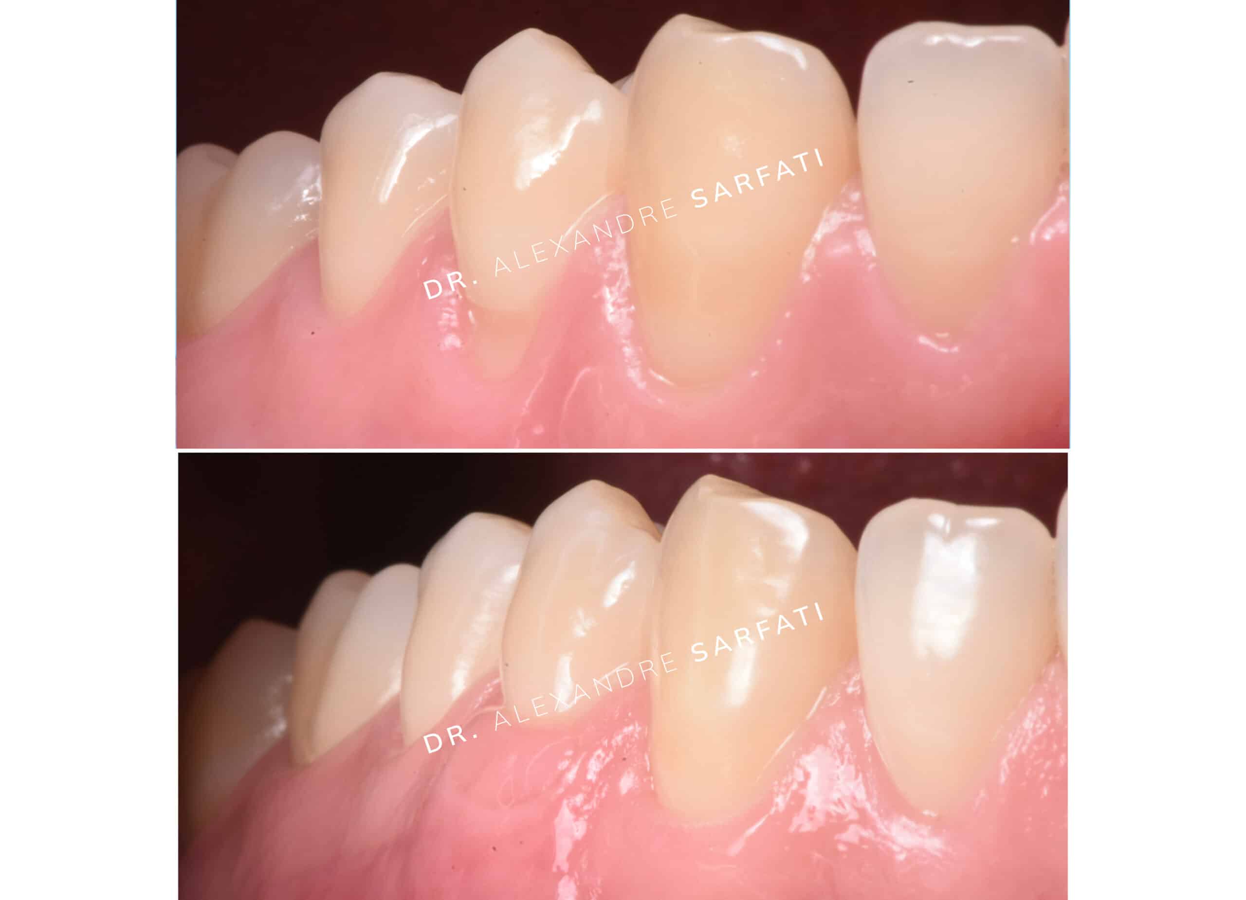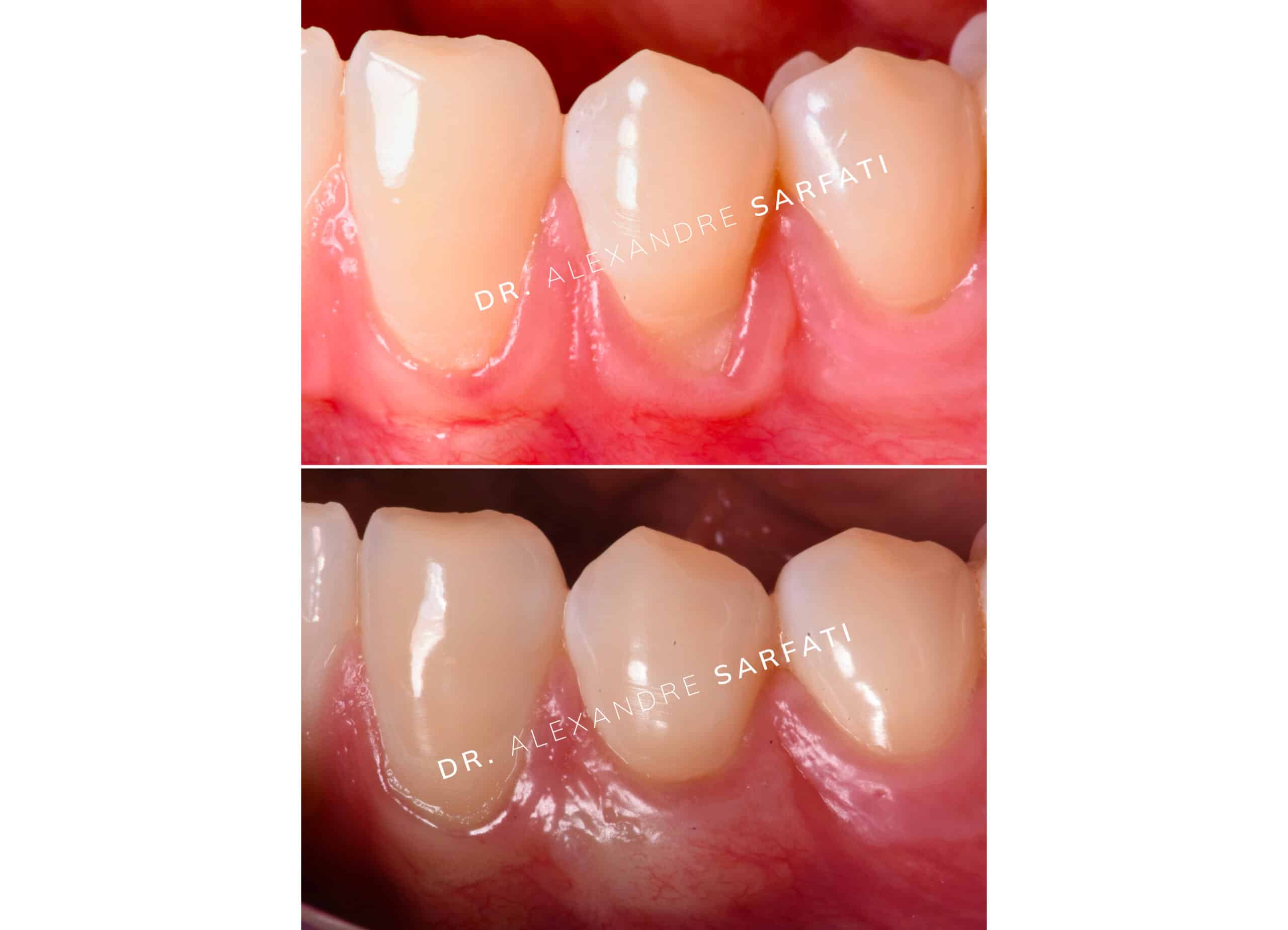 En recouvrant les racines exposées, on protèges ces zones sensibles de la dent et cela améliore le confort au quotidien. Cela améliore aussi l’esthétique du sourire en harmonisant la position des collets de dents.
